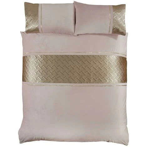 Create a magnificent sleeping sanctuary within your bedroom with the gorgeous Capri bedding set. Available in a blush and gold colour scheme, this bed set will be sure to add a stunning modern look to your room. This super soft velvet bedding features embellished shimmering panels and sequin detailing for the extra touch of elegance. Pair these duvet cover sets with matching eyelet curtains, filled boudoir cushion and a bed runner to complete your dream bedroom set – all sold separately. Contents – King size duvet cover (220x230cm) plus 2 pillowcases (50x75cm). Material – 50% Polyester and 50% Cotton reverse, 100% Polyester front. Care instructions – Machine washable and can be tumble dried on a low heat.