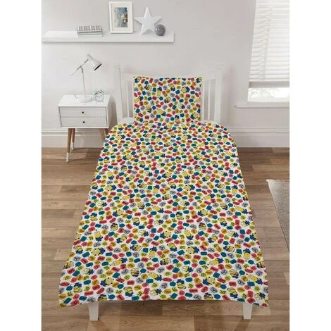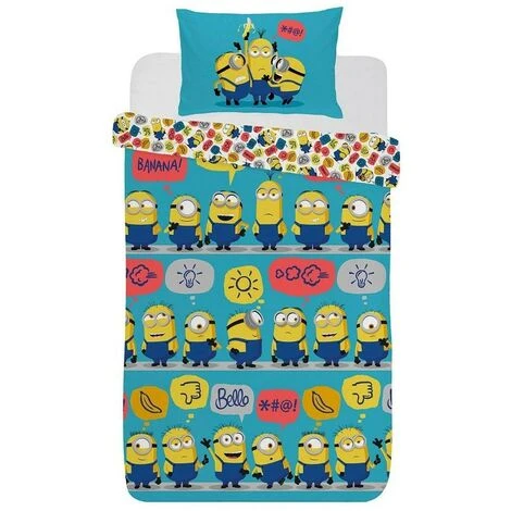 52% Polyester, 48% Cotton. Contents: Duvet Cover, Pillowcase. Design: Bubble, Repeat Print. Characters: Minions. 100% Officially Licensed. Reversible.