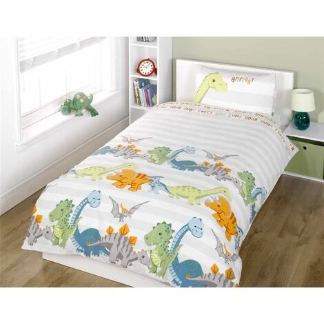 Featuring multiple, varied cute cartoony dinosaurs, this single duvet cover is great for any child with an interest in the prehistoric. The design displays multiple species of dinosaur in a beautiful cartoon style, under multicoloured text of various phonetic dinosaur sounds. The simple striped natural background looks great against the colours of the dinosaurs.