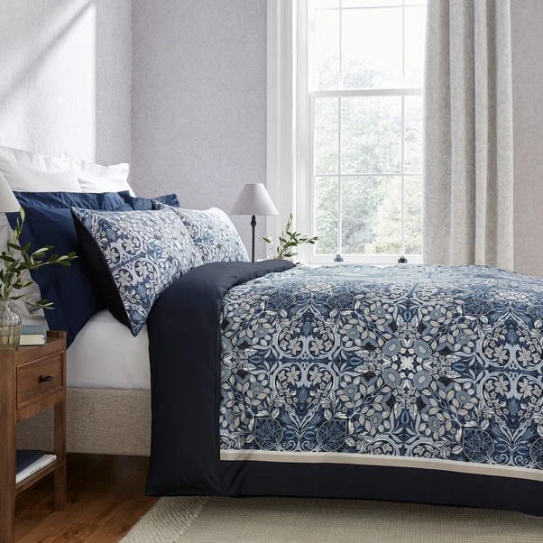 Dorma’s Kaleidoscope duvet set depicts a beautiful scarf design, framed with a contrasting border in plain navy. Crafted from a sumptuous 100% cotton sateen with a 300 thread count, the Kaleidoscope duvet cover set makes a luxurious choice for any bedroom. The reverse is matched in plain navy, perfectly contrasting with the rich hues of the Kaleidoscope design on the face. The set includes standard pillowcases with a delicate piping detail and finished with a zipper fastening for ease. For a layered look or additional comfort a pair of Kaleidoscope pillowcases is available to buy separately. Designed to coordinate with colour matching plains from the 300 thread count Dorma bedding range.