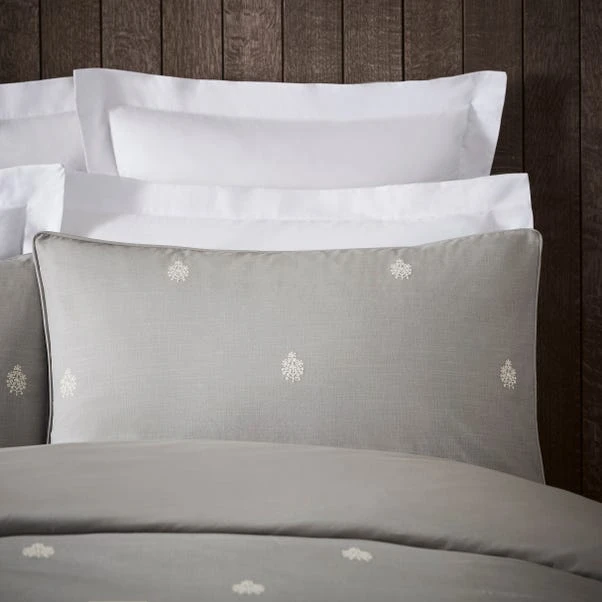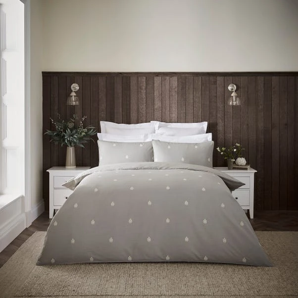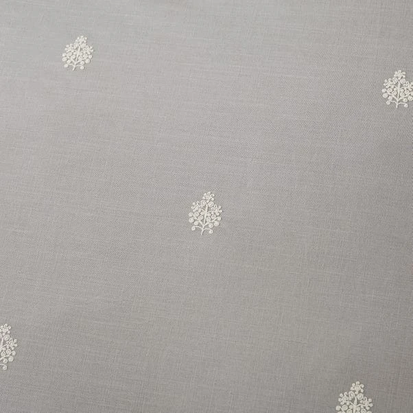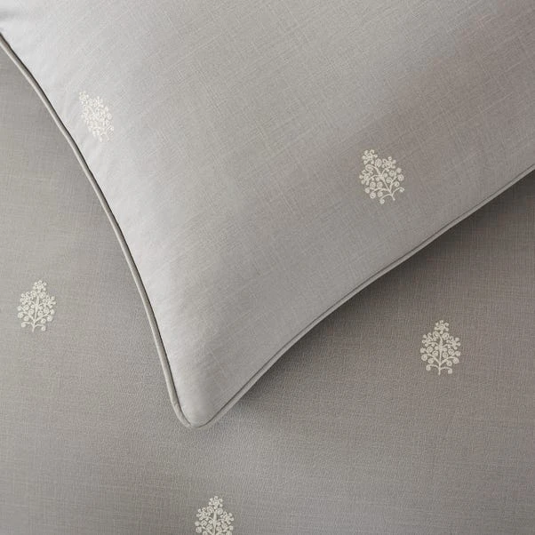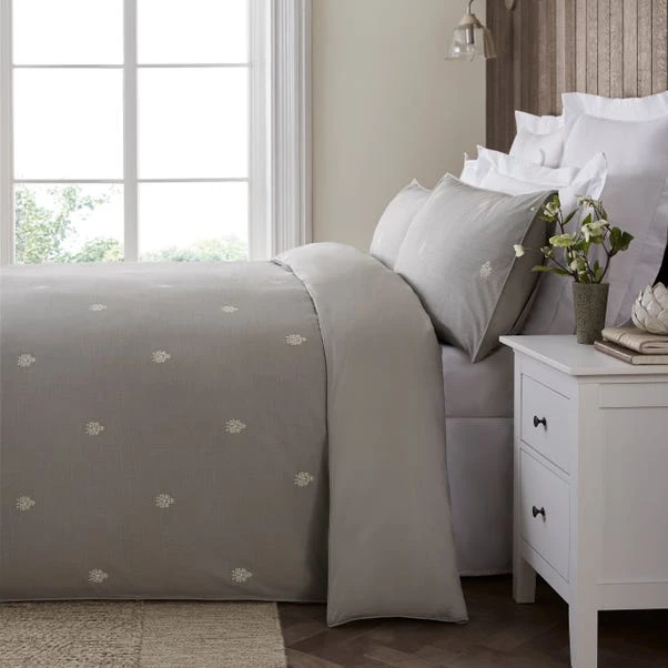 Adorned with an intricately embroidered all-over motif in white on a 100% cotton slub-percale in grey, this duvet set features a 300 thread count reverse. With a soft texture and a grey background, this quilt cover set would compliment any bedroom interior beautifully. The duvet cover is fastened with a zipper, making changing the bedding easy. Pair the duvet cover set with the Dorma Purity Carro standard pillowcase pair to create a layered hotel look.