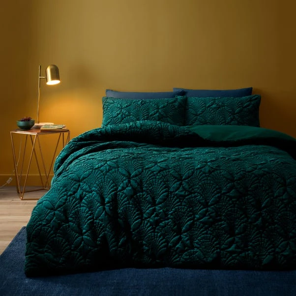 Fashioned with a rich emerald green colourway, our Indra Velour duvet cover set features an embellished front design. Crafted from a polyester material, the set is easy to care for and is fully machine washable. The duvet cover set has been finished with a button closure which helps secure the cover around the duvet whilst in use.