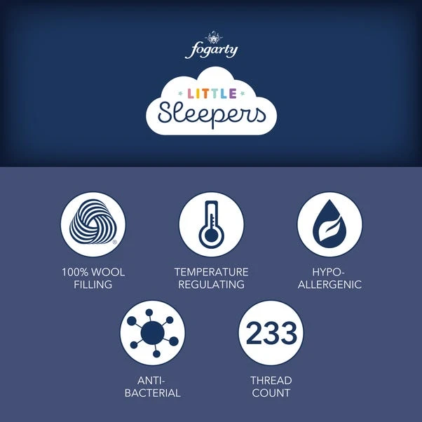 This duvet from Fogarty’s Little Sleepers range is filled with 100% natural wool to help regulate your little one’s temperature for a more restful night’s sleep all year round. Finished with a cotton cover adding extra warmth and cosiness, this duvet is fully machine washable, non-allergenic and suitable for those 12 months or older.