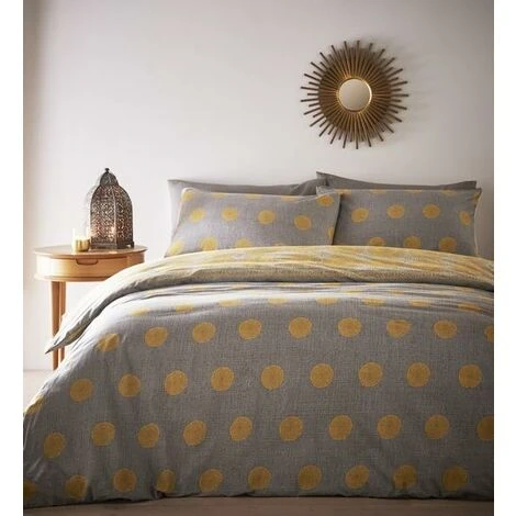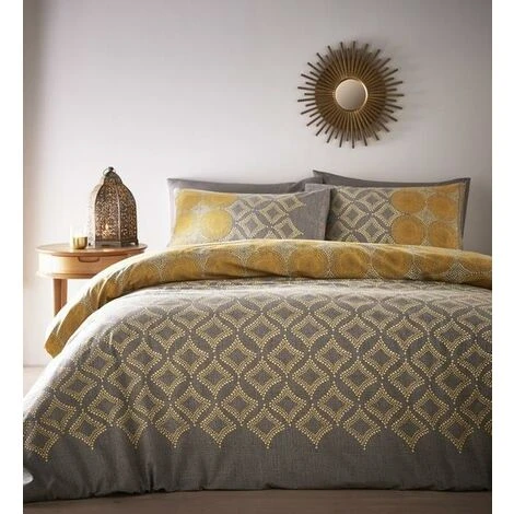 This detailed geometric super king size duvet cover (220cm x 260cm) and 2 pillowcases (50cm x 75cm) will be sure to transform your bedroom into a contemporary design. Joel is an ethnic design formed with hand painted dots beautifully crafted to cascade from the top border down to jewel like motifs, in fashionable colours of grey and ochre, with a soft linen texture print. This is also available to buy in double and king bed sizes, as well as in a plum colour.