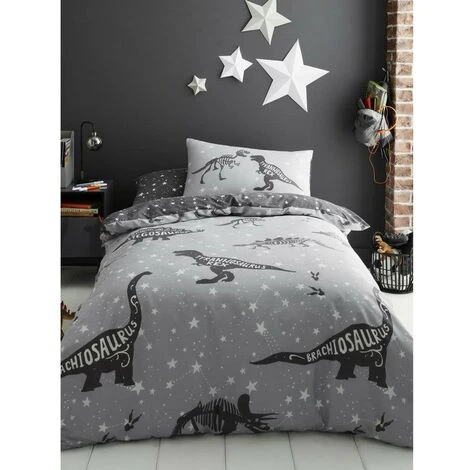 50% Cotton, 50% Polyester. Contents: Duvet Cover, Pillowcase. Design: Brachiosaurus, Constellation, Star, Stegosaurus, T-Rex. Reversible.